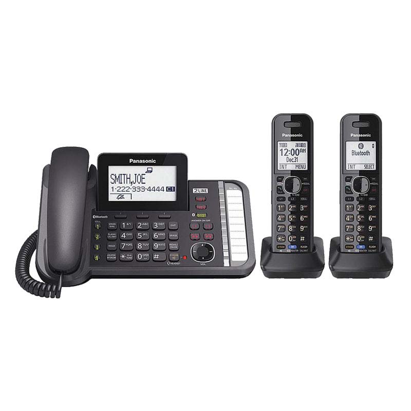 تلفن 2خط پاناسونیک مدل KX-TG9582تلفن پاناسونیک دو خط panasonic kx tg9582 یکی از باکیفیتترین تلفنهای بیسیم به سفارش آمریکا و ساخت کشور مالزی می باشد. این تلفن برای فضاهای کاری و شلوغ، بسیار مناسب است. این محصول از دو خط تلفن به صورت همزمان پشتیبانی میکند و از یک تلفن رومیزی و دو گوشی بیسیم تشکیل شده است. شما میتوانند تعداد گوشیهای بی سیم این تلفن را تا 12 عدد افزایش دهید kx tg9582 دارای و قابلیت برقراری کنفرانس سه طرفه و ساعت هشدار می باشد.