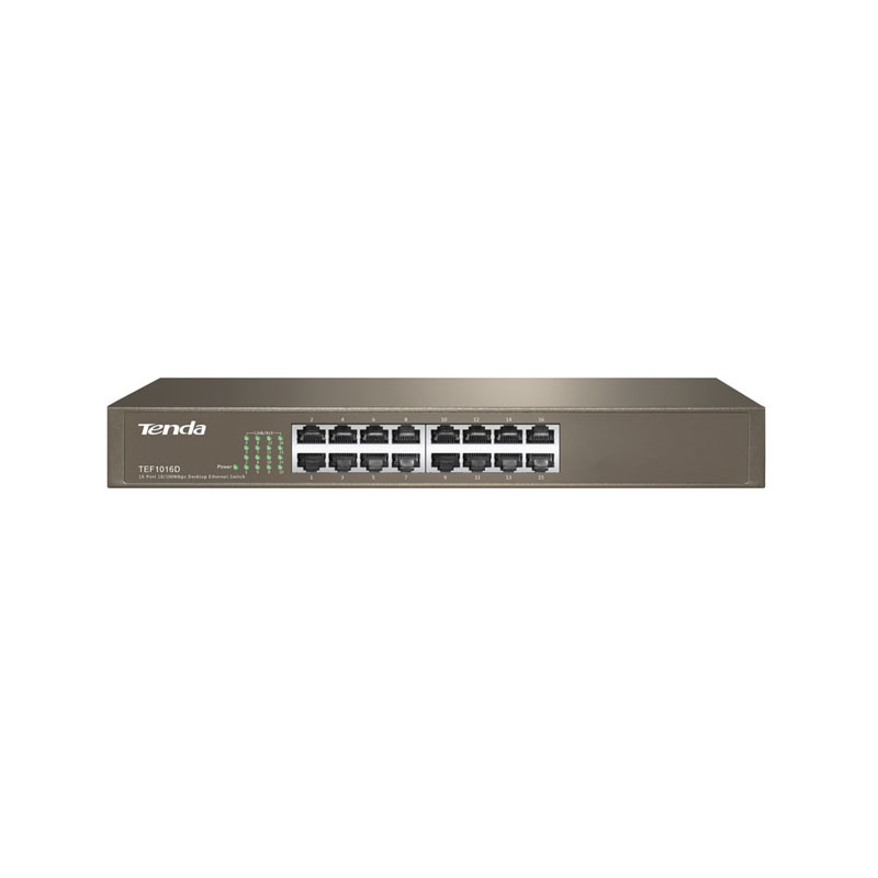 سوئیچ شبکه 16 پورت تندا مدل TEG1016Dسوییچ TEG1016D شرکت تندا (TENDA)، دارای 16 پورت LAN است و از نوع غیر مدیریتی به شمار میرود. پورتهای به کار رفته در سوییچ از نوع Auto-MDIX و Auto-Negotiation هستند و قادرند به صورت دوطرفه و همزمان به نقل و انتقال اطلاعات بپردازند. جنس بدنهی این سوییچ از فلز است و برای نصب درون رک (Rack) ساخته شدهاست که اصطلاحا رکمونت (Rackmount) نامیده میشوند.